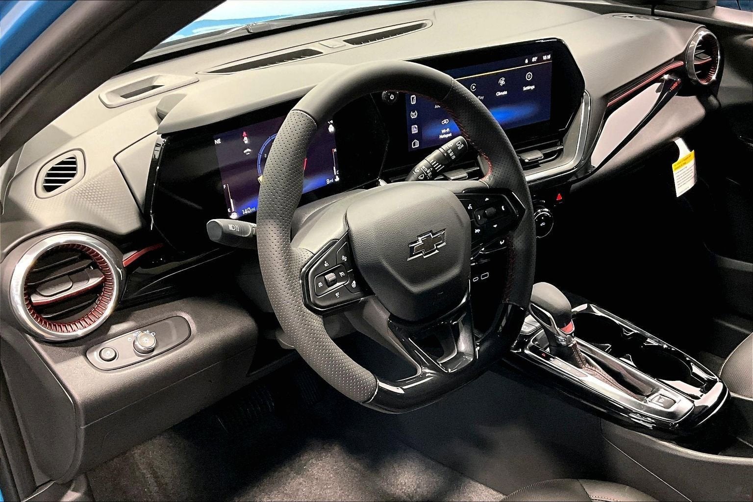 Marina Blue Metallic 2026 Chevrolet Trax 2RS FWD 6-Speed Automatic ECOTEC 1.2L Turbo 2-Way Adjustable Front Head Restraints, 2-Way Power Driver Lumbar Seat Adjuster, 3.50 Final Drive Axle Ratio, 4-Way Manual Front Passenger Seat Adjuster, 4-Wheel Disc Brakes, 6 Speakers, 6-Speaker Audio System Feature, 8-Way Power Driver Seat Adjuster, ABS brakes, Adaptive Cruise Control, Air Conditioning, Alloy wheels, AM/FM radio: SiriusXM, Auto High-beam Headlights, Automatic temperature control, Brake assist, Bumpers: body-color, Compass, Delay-off headlights, Driver Confidence Package, Driver door bin, Driver vanity mirror, Dual front impact airbags, Dual front side impact airbags, Electronic Stability Control, Emergency communication system: OnStar One Essentials, Evotex Seat Trim, Exterior Parking Camera Rear, Front and Rear Jet Black All-Weather Floor Mats, Front anti-roll bar, Front Bucket Seats, Front Center Armrest, Front reading lights, Front wheel independent suspension, Fully automatic headlights, Heated door mirrors, Heated Driver and Front Passenger Seats, Heated front seats, Heated steering wheel, Illuminated entry, Lane Change Alert with Side Blind Zone Alert, Leather steering wheel, License Plate Front Mounting Package, Low tire pressure warning, Occupant sensing airbag, Outside temperature display, Overhead airbag, Overhead console, Panic alarm, Passenger door bin, Passenger vanity mirror, Power door mirrors, Power driver seat, Power Sliding Glass Sunroof with Manual Shade, Power steering, Power windows, Premium audio system: Chevrolet Infotainment 3, Radio data system, Radio: AM/FM Stereo Audio System, Rear Cross Traffic Alert, Rear Park Assist, Rear window defroster, Rear window wiper, Remote keyless entry, Security system, SiriusXM Trial Subscription, Speed control, Split folding rear seat, Spoiler, Sport steering wheel, Steering wheel mounted audio controls, Sunroof Package, Tachometer, Telescoping steering wheel, Tilt steering wheel, Traction control, Trip computer, Variably intermittent wipers, Wheels: 19 Black-Painted Machined Aluminum, Wireless Apple CarPlay/Wireless Android Auto, Wireless Charging.